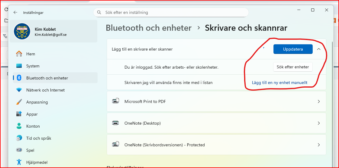 - Välj UPPDATERA om din skrivare inte dyker upp (se bild 2)